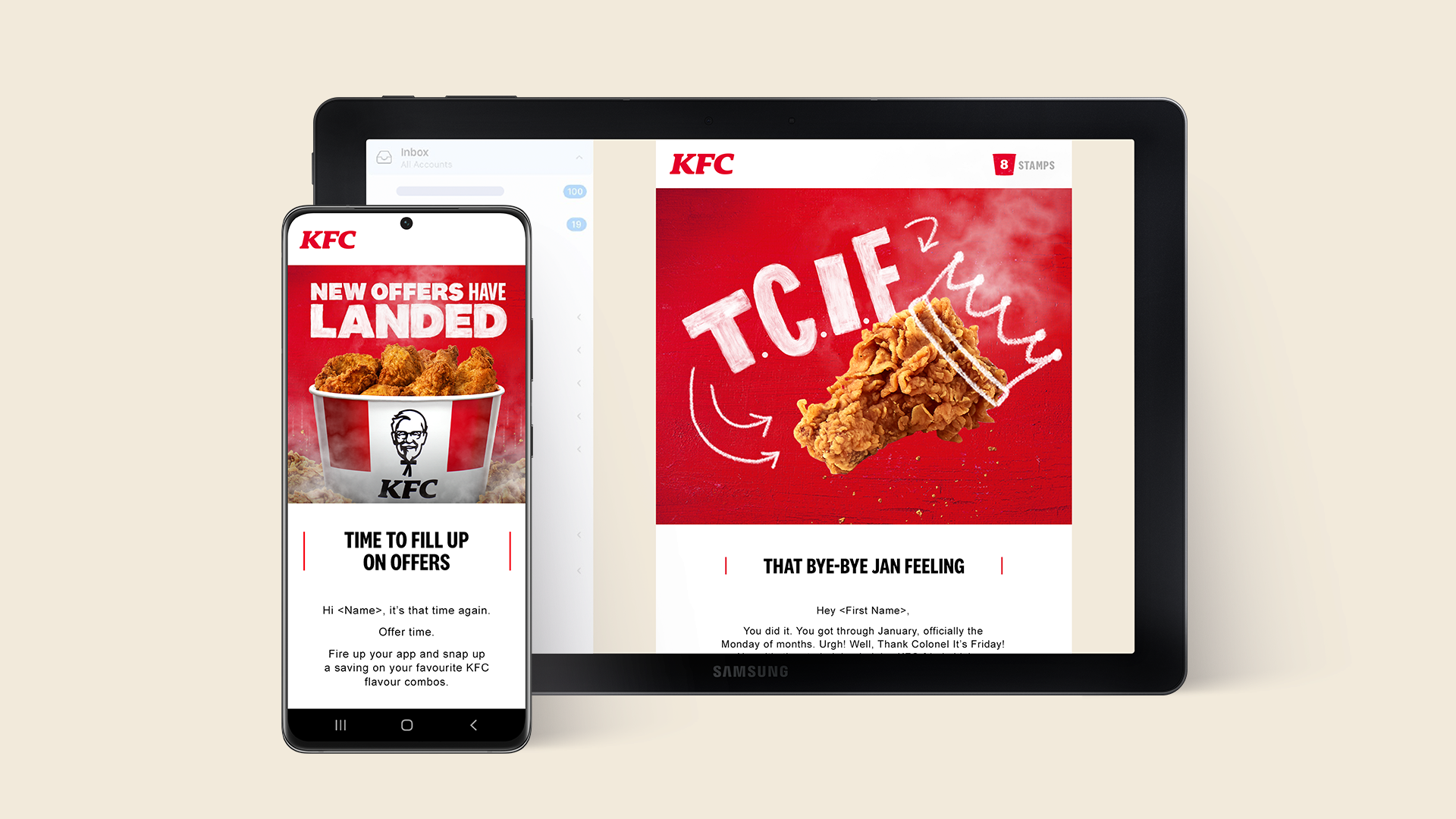 Fun header image and overall email designs for KFC, which often resulted in fried chicken cravings.